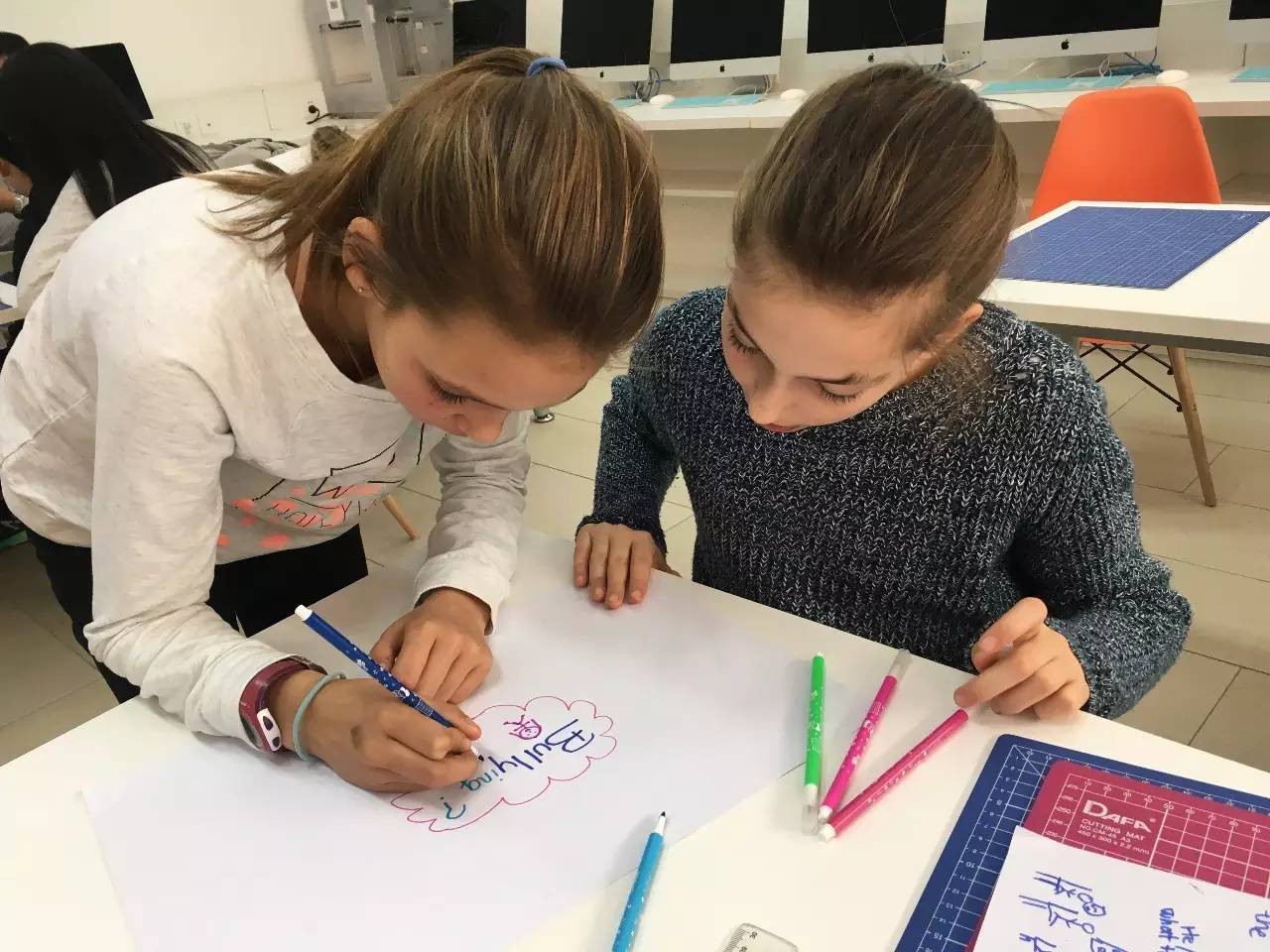 在团队合作课堂上,孩子们自己经过研究、头脑风暴,相互提出质疑、意见和建议,利用已有和边做边学到的知识,以小组为单位,设计研发出他们想要的创新,最大化地理解和体验什么是现实世界里的创新。
